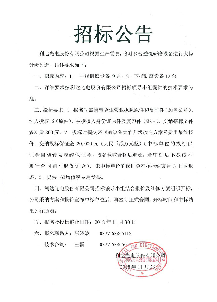 研磨設(shè)備大修升級(jí)改造招標(biāo)公告
