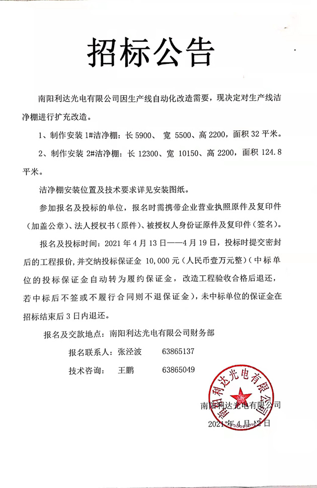 生產線潔凈棚擴充改造招標公告